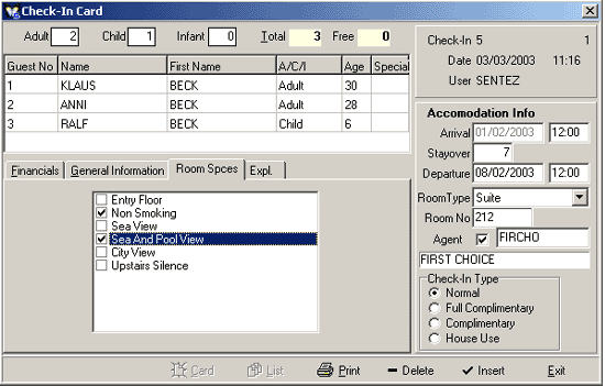 is displayed. Also in the Room No field the Card button can be