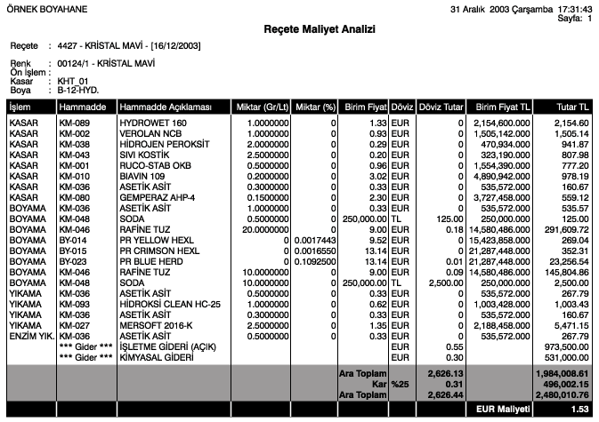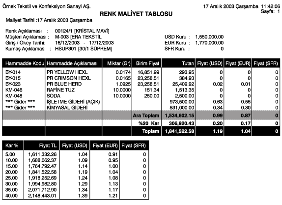 verilerin Hammadde, Miktar, Birim Fiyat, Tutar bilgilerini görebilirsiniz.Kar