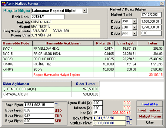 Ayrıca Renk ve Reçete Maliyet Analizleri ; istenirse kar analizleri