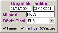 butonu ile ekrana gelen pencere üzerinde Geçerlilik Tarihleri, Müşteri (Bu