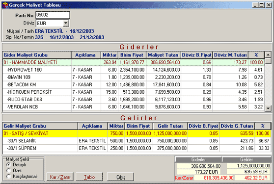 Tablo butonu ile gerçek maliyet dağılımlarını takip edebilrisiniz.