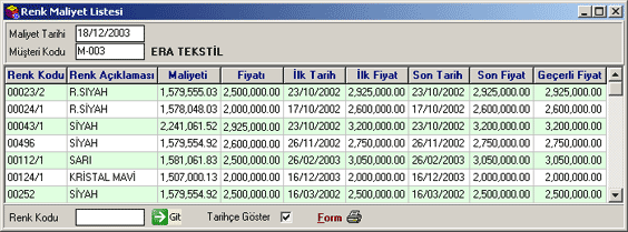 Tarihçe Göster seçeneğinin seçilmesi durumunda form üzerine Renk Maliyet