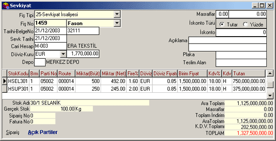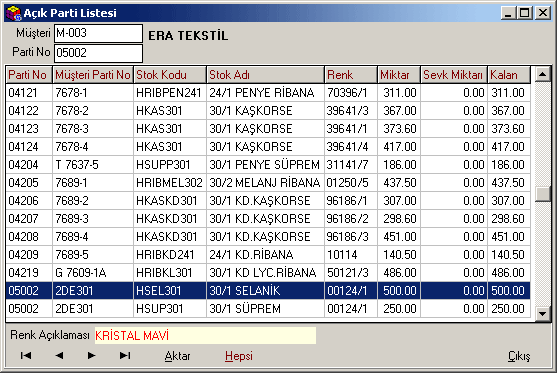 olur). Aktar butonuna basılarak parti bilgilerinin sevk fişine
