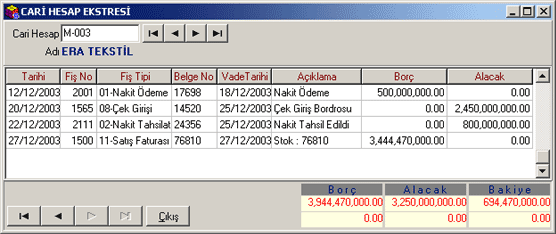 hesaba ait ekstre bilgileri ekrana getirilir. Örnekte ; M-003 nolu