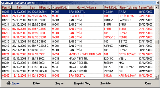 Listesini ekrana alabilrisiniz. Liste üzerinde yer alan partilerden sevkiyat
