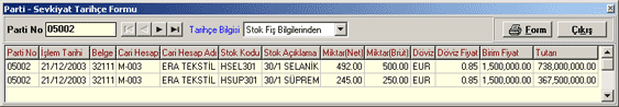 Form butonuna basarak Parti - Sevkiyat Tarihçe formu dökümünü alabilirsiniz.