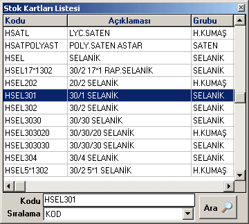 ile stok listesi alınarak seçim yapılabilir. Eğer aranan stok listede