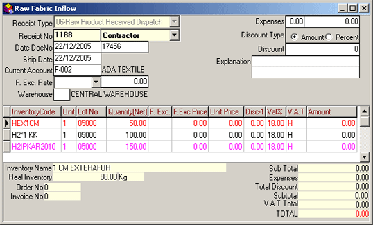 the entries of raw fabric shipmentes to parties. When the receipt screen
