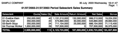 Based on the salesclerk; reports that display cash sales or customer orders separately and include salesclerk quota quantities, sales and bonus amounts could be generated. |