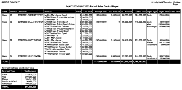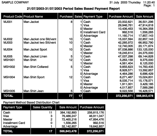 Reports displaying the Product Name. Payment Type, sales amounts and listing the payment dispersions based on the sales can be generated as above. |