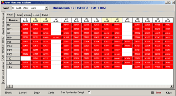 Bu sekme seçildiğinde gelecek ekranda, makinaların aylık planlama durumları