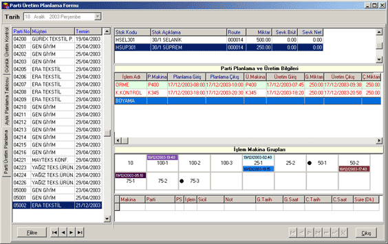 Bu sekme seçildiğinde gelecek ekranda, Partilere ait planlama ve üretim