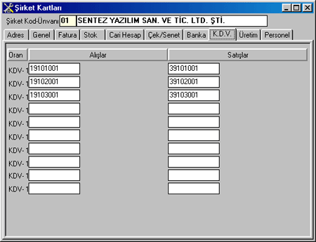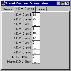 Program genelinde kullanılacak KDV oranlarının tanımlandığı bölümdür.. 10 değişik KDV oranı tanımlanabilir. Bu alanda tanımlanan KDV oranlarını stok kartında sıra numarası