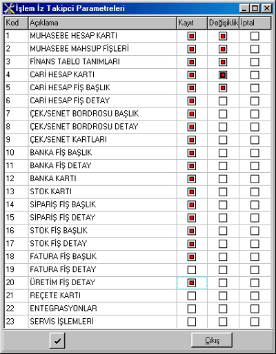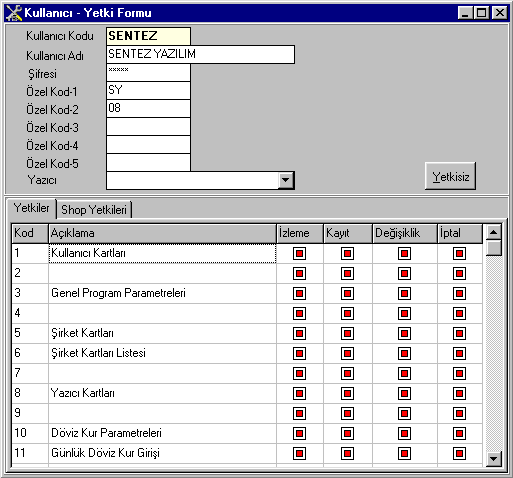 ekran ve yapılabilecek her işlem için dört bazda (İzleme, Kayıt, Değişiklik