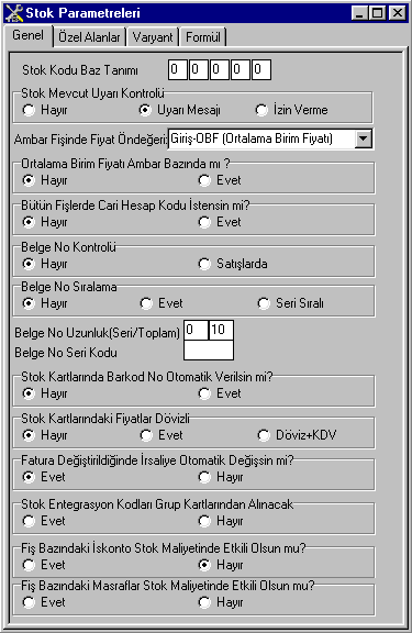 Hayır seçeneği seçilir ise, Varyant tablosu veya Seri No kullanılmaz.