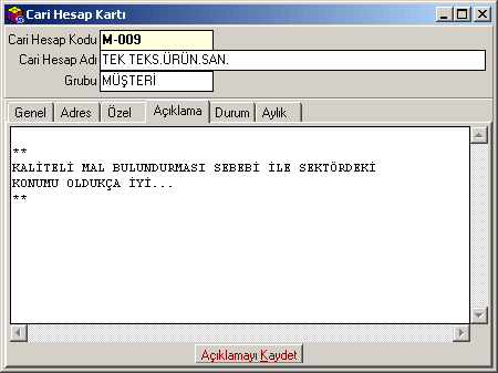 tanımlanan cari hesaplara ait açıklama bilgileri detaylı olarak takip