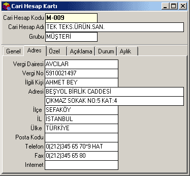 Cari hesap kartı üzerinde, daha önce girilen bilgiler doğrultusunda istenen