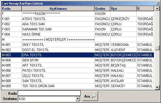 M, Fasonculara F verilmesi gibi.Cari Hesap Kodu alanında liste butonu