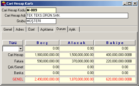 Şekil 6 Cari Hesap Kartı / Durum Sekmesi