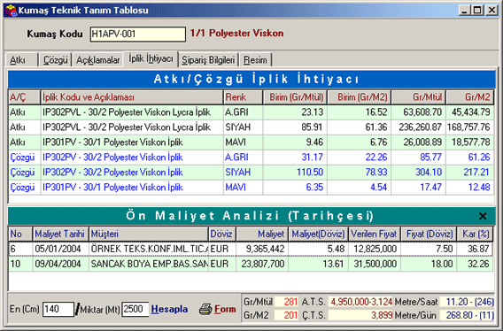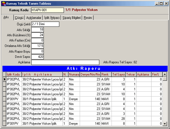 zaman formun alt kısmına müşteri siparişinde belirlenen kumaşa ait iplik