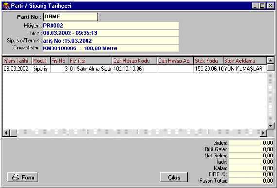 Form butonuna basarak Parti/Sipariş Tarihçesi dökümü alabilirsiniz.